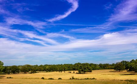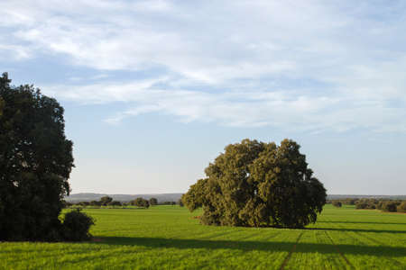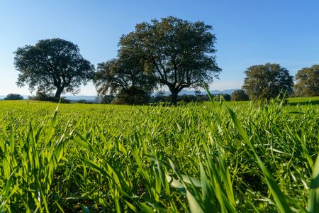 panoramic view of a field of green cereal, with spreading oak trees on a spring day with blue sky and some clouds, rainfed agriculture of barley and wheat, copy space