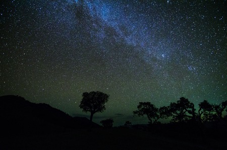 holm oak at night with stars, in the natural park of Cornalvo, Extremadura, Spain