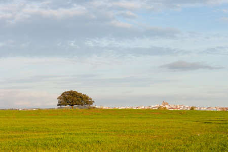 A lonely oak in the middle of the meadow and in the background the town of Malpartida de Plasencia. Landscapes