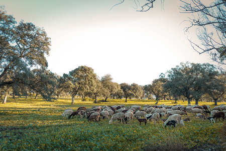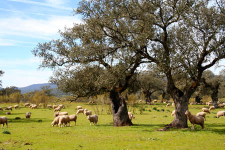 sheep grazing in the Dehesa de Extremadura next to some holm oaks