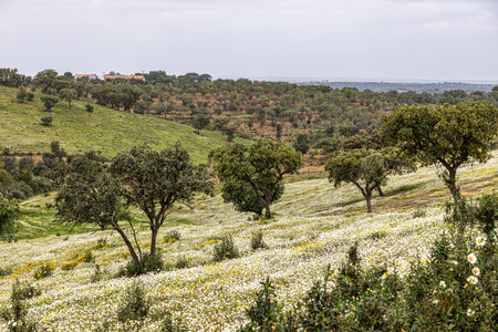 Typical view of Spring landscape in Alentejo with white daisies and holm oak trees.