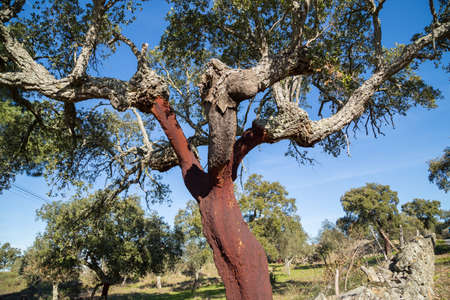 several cork oaks show their trunk stripped of the trunk at little of the harvest.