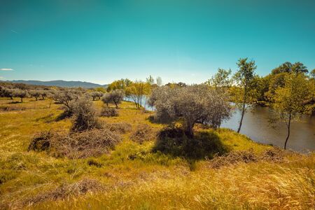 Beautiful spring landscape with river and blue sky in South of Spain.