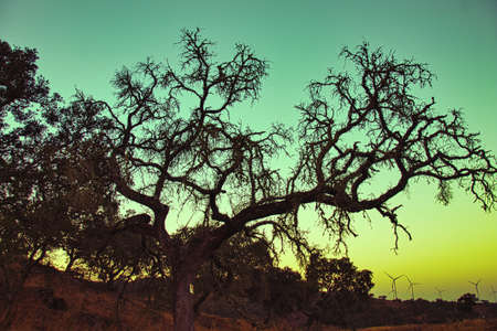 Old Cork oak tree (Quercus suber) in evening sun, Alentejo Portugal Europe