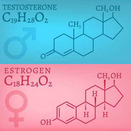 Hormones molecular formules - estradiol and testosterone. illustration isolated on a light blue and pink background.