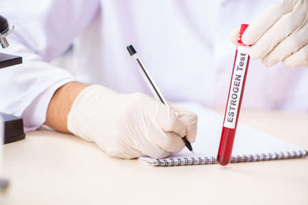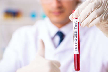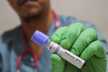 Text Estrone E1 of is written on a bottle sample with background of a doctor with a medical glove mask. Medical concept