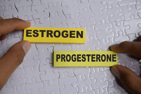 Concept of estrogen or progesterone write on sticky notes isolated on Wooden Table.