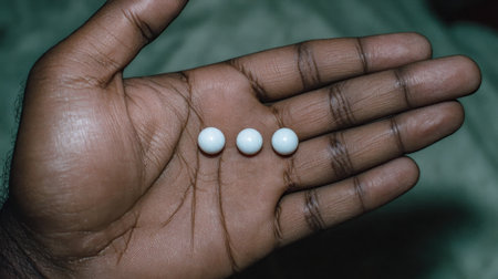 A close-up photograph displays a hand holding three white pills. The image reveals details of skin texture. The composition utilizes a shallow depth of field, with soft focus and muted colors, potentially suitable for healthcare or pharmaceutical illustrations. The lighting appears soft and diffused, creating a neutral backdrop for commercial use.