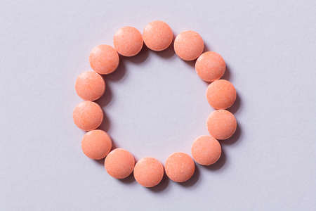 top view of pink pills in shape of circle on white