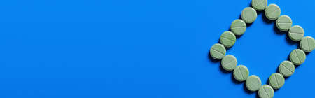 top view of green pills in shape of rhombus on bright blue background, banner