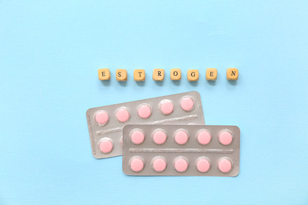 Blisters of hormonal pills with the word ESTROGEN on blue background