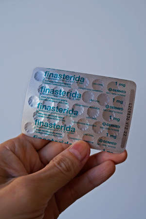 Rio de Janeiro, Brazil - April 30, 2021: Blister pack of finasteride pills on hand.