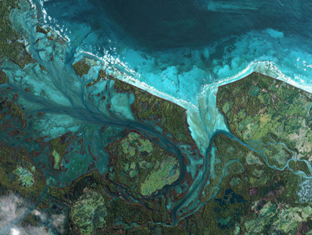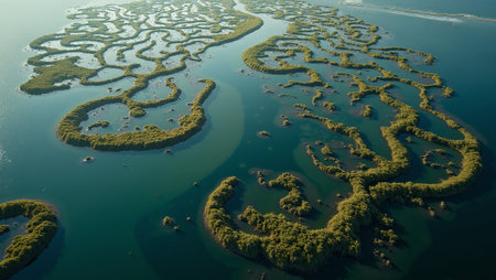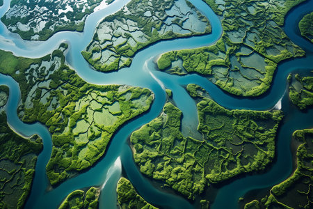 Aerial River Delta Stunning top-down perspective of river meeting ocean, creating intricate branching patterns as waterways divide and subdivide through
