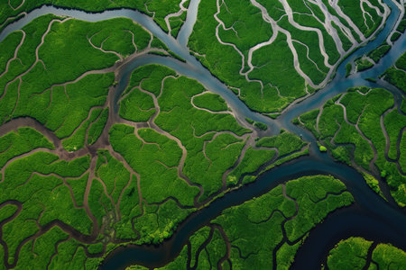 Mangroves, top view. Mangrove forest and winding rivers. Tropical background