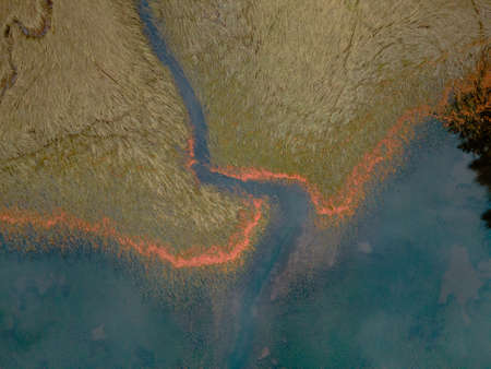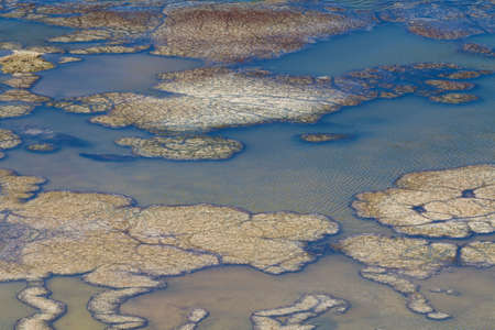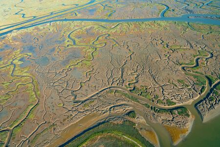 Abstract textures and veins cutting thru the wetlands of a tidal river system in Tasmanias Swan river area, Australia