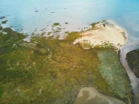 Scenic aerial view of the Atlantic ocean coast and estuary of Ruisseau de cires in Saint-Brice, Gironde, France