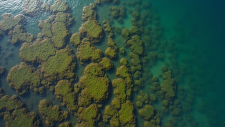 A breathtaking aerial photograph captures a coastal shoreline where vibrant green vegetation meets crystal clear blue water. The water appears shallow and turquoise in color, revealing intricate patterns of coral reefs and marine life. The land is covered in lush greenery, including trees and shrubs, suggesting a tropical or subtropical climate. The image evokes a sense of tranquility and natural beauty.