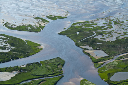 Generative AI : Aerial view of a nature reserve next to the Wadden Sea in Friesland The Netherlands