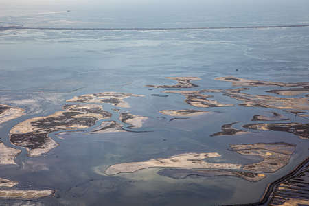 View from the air of the marshy islands to the North East of the Venice Lagoon, Italy