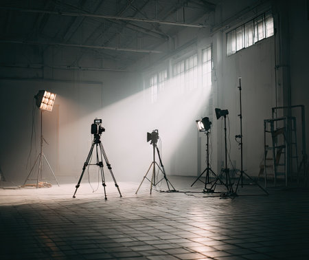 A woman stands in a studio, illuminated by professional lighting equipment. The scene features softboxes and lamps, creating a moody ambiance. The composition highlights the subject against a dark backdrop. Suitable for advertising, portraiture, and various editorial applications, this image offers copy space for diverse purposes.