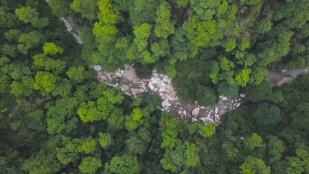 Top view of wild forest valley with rocks and stream. Clip. Natural landscape of dense green forest with rock ledges and mountain rivers.