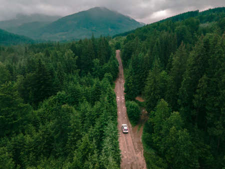 aerial view of carpathian mountains overcast weather suv car on trail road copy space