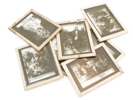 Stack old photos isolated on white background. Postcard rumpled and dirty vintage. Retro card