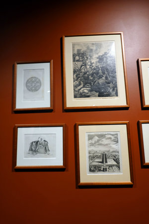 Litomysl, Czech Republic, 17 April 2022: castle chateau baroque representative interior with baroque classic furniture, vintage framed photographs on the table, porcelain figurines