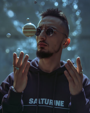 Young man in a black jacket against the background of the galaxy.