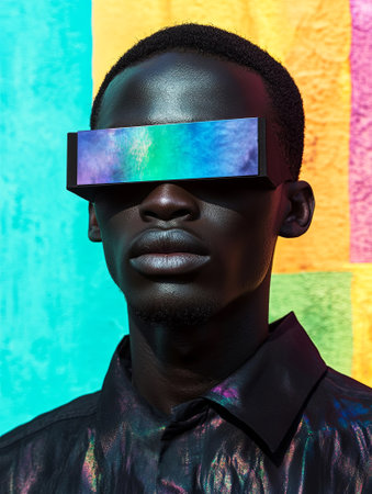 Fashionable male model wearing unique sunglasses stands against a bright, colorful backdrop, highlighting modern aesthetics and creative visual storytelling, AI generated