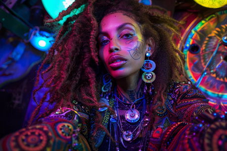 Beautiful african american woman with curly hairstyle and glowing eyes