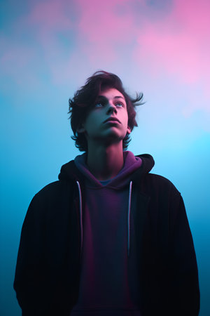 Portrait of a young man in a hoodie on a blue background.