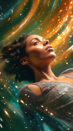 A woman stands in profile, her glowing silhouette blending with vibrant cosmic elements. Soft colors illuminate her face, creating a tranquil atmosphere filled with wonder and serenity.