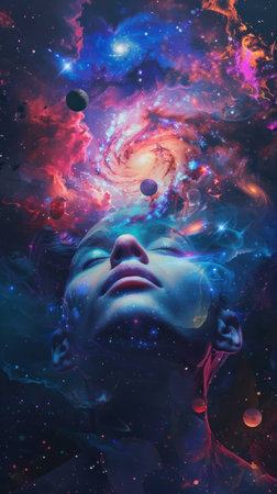 Dreamy person with cosmic background, head tilted back, surrounded by colorful galaxies and stars, representing imagination and exploration of the universe.