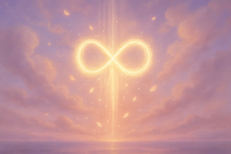 A glowing, ethereal infinity symbol in the clouds during sunset, creating a sense of timeless beauty and infinite connection to nature.