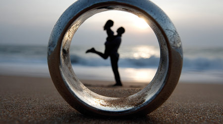 A silhouette depicts a couple embracing on a beach at dusk. The image is framed by a ring, creating a unique visual. The warm light suggests a sunset ambiance, with elements of sand and ocean. This photograph could be used for various commercial or editorial purposes related to relationships.