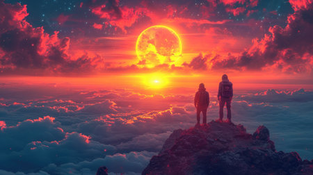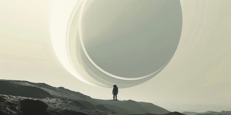 A silhouette of a person stands in a stark landscape beneath a dramatic red sky and a bright, glowing circle. The image showcases high contrast, with deep shadows and vibrant colors. The overall aesthetic is stylized, suggesting possibilities for editorial uses or conceptual illustrations.