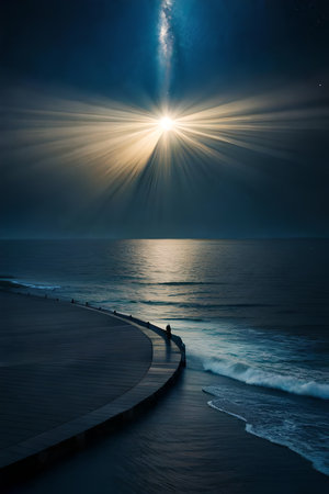 Moonlight in ocean landscape. The ocean stretches out as far as the eye can see, its surface a canvas of deep, midnight blue. AI generated image