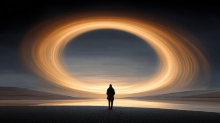 A man stands at the edge of a black hole, gazing into the depths of the universe, surrounded by stars in a mesmerizing cosmic abyss