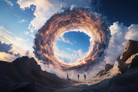 A stunning circular portal hovers in the sky, surrounded by vibrant clouds, while three figures stand on rocky terrain, contemplating its mysterious presence.