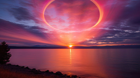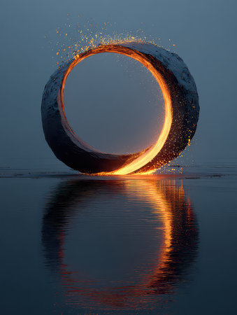 This captivating abstract sculpture features a glowing circular design, reflecting beautifully on tranquil water. It embodies modern artistic expression.