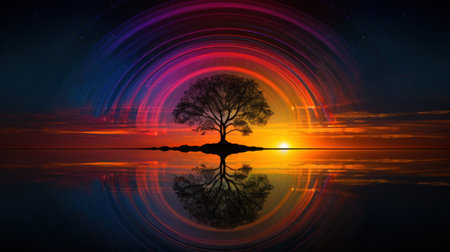 A tree is shown in the middle of a lake with colorful swirls, AI