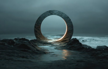 A captivating circular portal stands on rocky shores, illuminated by a soft light. The ocean waves crash beneath a moody sky, evoking mystery and serenity.
