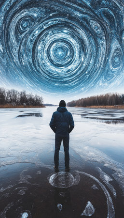 Contemplative Figure Gazing Upward at an Overworld Vortex in a Cold Winter Landscape Painting