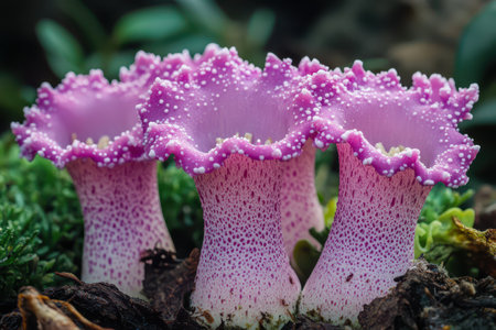 Purple macro closeup mushrooms. Botanical forest. Generate Ai