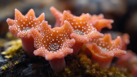 Close-up of coral-like flowers growing on the ground, with numerous corals in various shapes and colors. The petals have small dots that resemble dewdrops. This is an award-winning photo taken with a Sony A7R IV camera. It was shot from low angles using macro lenses, creating a dreamy atmosphere. In the background, there were various mosses, as well as other unique plants. --ar 53:30 --v 6.1 Job ID: 516d3a1a-9c37-4dc3-921f-11d8f4dc1826
