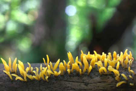 interesting beautiful yellow inedible coral mushrooms Calocera viscosa growing in forest moss
