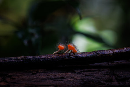 Champagne (red hairy cup fungi) mushrooms in rain forest, Thailand. Take photos by close up view.