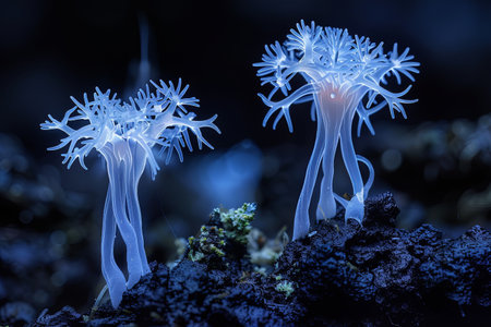 close-up of coral polyps capturing plankton in the dark, created with generative ai