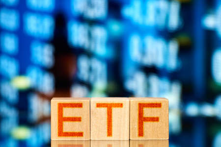 ETF, Exchange Traded Fund, realtime mutual index fund that can trade in equity stock market, cube wooden block with alphabet building the word ETF